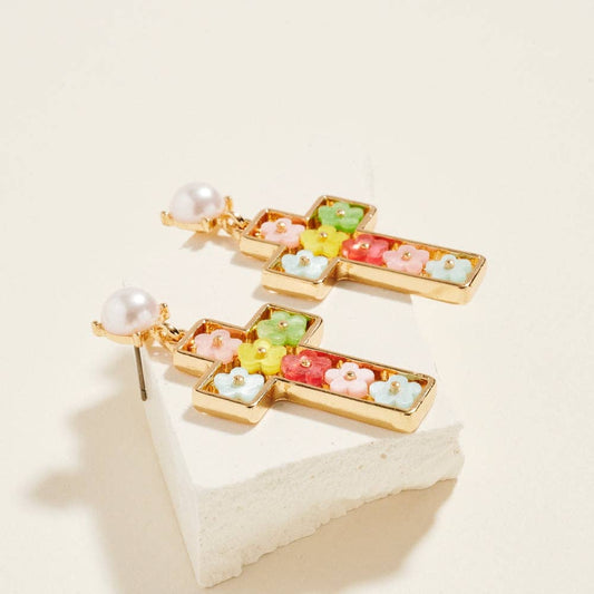 Cross Shaped Floral Filled Pearl Post Earrings