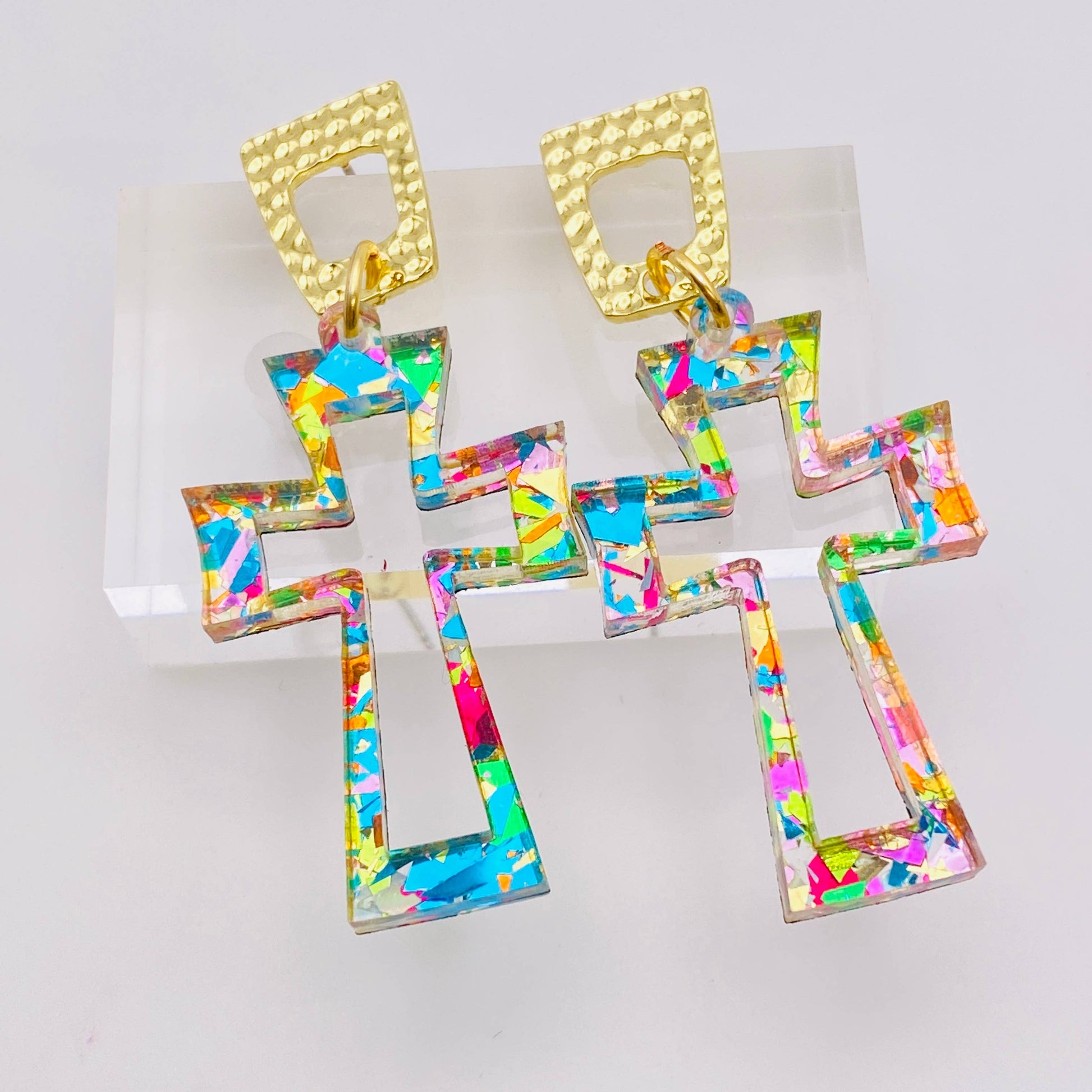 These eye-catching earrings feature a striking cross design made from a colorful, iridescent acrylic material that reflects light beautifully. Each earring showcases vibrant hues of blue, pink, and gold, creating a playful yet elegant look. The cross is outlined with a clear finish that enhances its geometric shape, while a hammered18 karat gold plated square attachment adds a touch of sophistication. Perfect for accessorizing a variety of outfits, these earrings blend contemporary style with a classic symbol, making them an ideal choice for both casual and formal occasions.