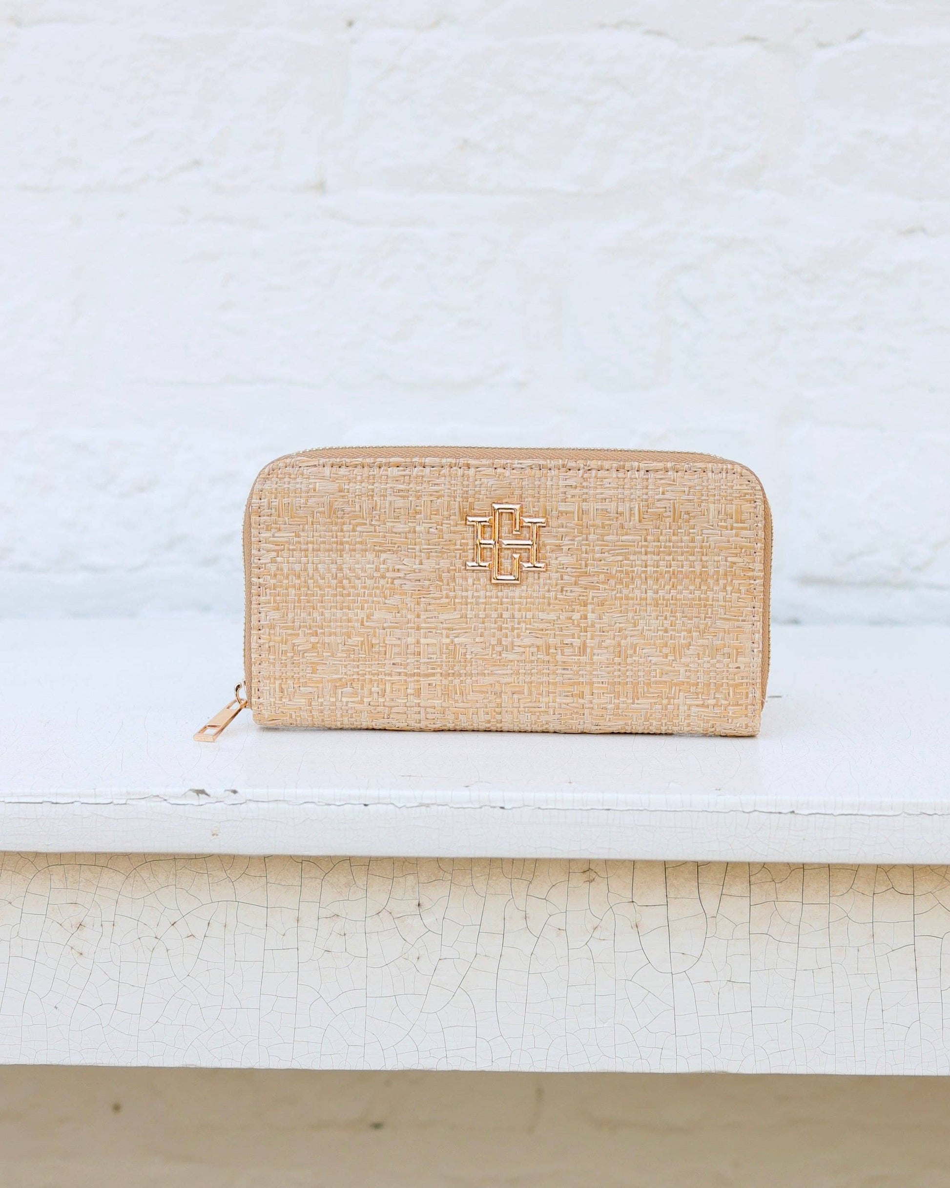 he Penelope Wallet in Natural Lattice straw features an elongated zip design with a central zippered coin pouch and two sets of card holders for organized storage. An outside slit pocket offers quick-access space, making it a stylish and practical accessory that holds all your daily essentials effortlessly.